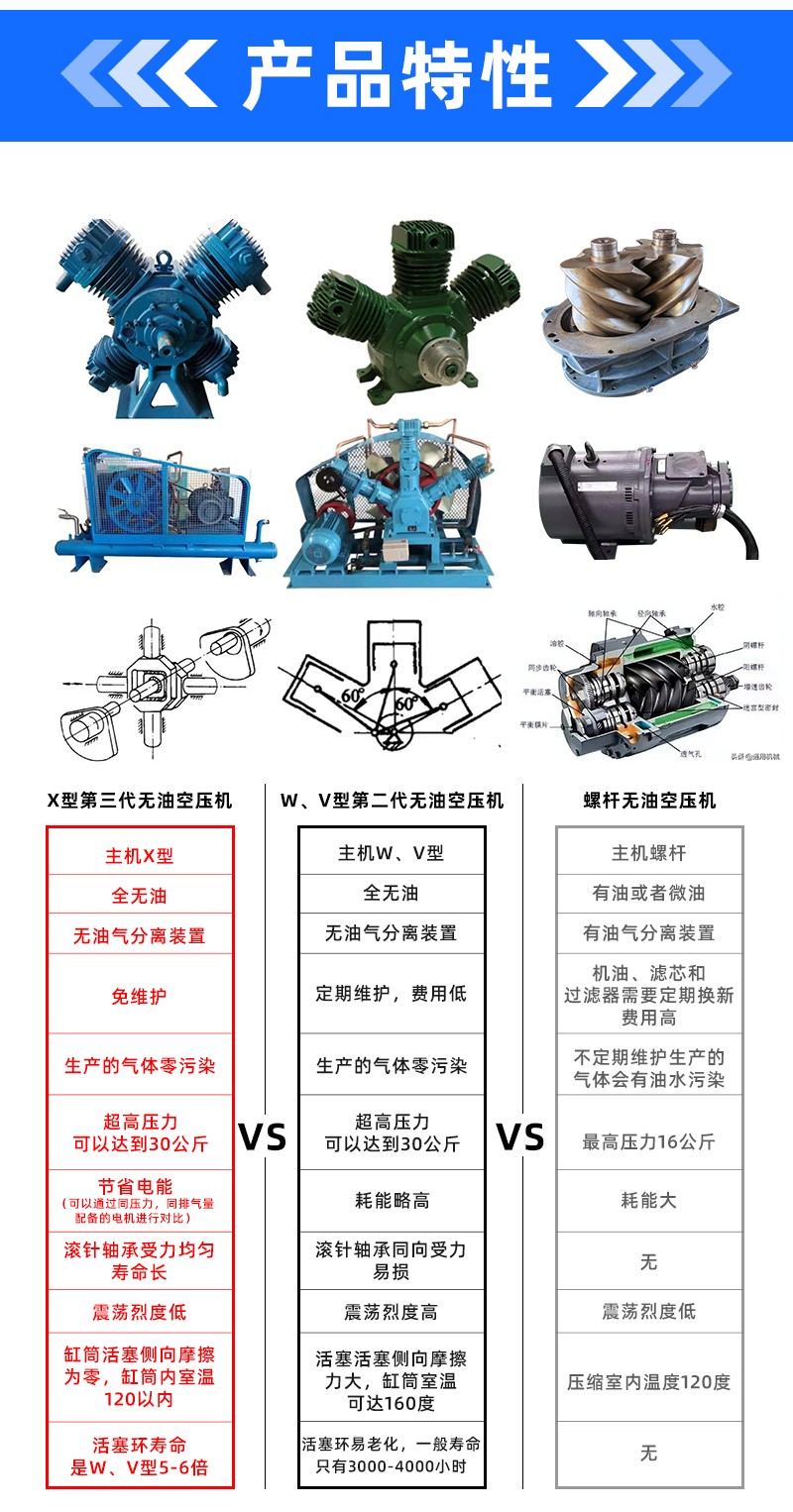无油空压机是一种常用的工业设备,用于产生压缩空气以供各种设备和工艺的使用。它与传统的润滑空压机相比,无油空压机具有更加卫生、无污染的特点,因此在一些对空气质量要求较高的场合得到了广泛应用。无油空压机的型号多种多样,每种型号都有其特定的适用领域和特点。下面将介绍一些常见的无油空压机型号及其特点。
