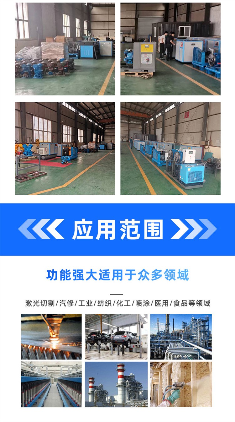无油空压机,作为一种高效节能的压缩机,具有广泛的应用场景。它在工业领域中发挥着重要作用,同时也在商业、科研等领域得到广泛应用。在工业领域中,无油空压机被广泛应用于各种工程项目中,如汽车制造、航空航天、电子制造等领域